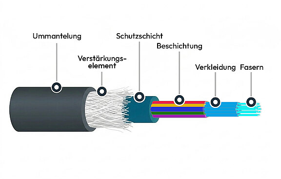 Das Glasfaserkabel besteht aus einem Kern (dem zentralen Glasfaser- oder Kunststoffstrang), der von einer Mantelschicht umgeben ist. Der Kern hat einen höheren Brechungsindex als die Ummantelung.